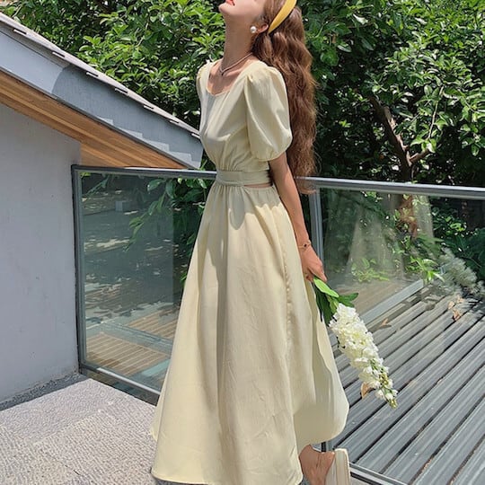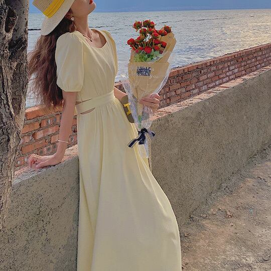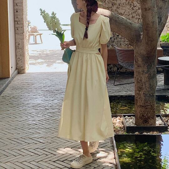 後ろでリボン結びをするので清楚なイメージは残しつつ、肌をチラ見せできる夏らしいデザインです。